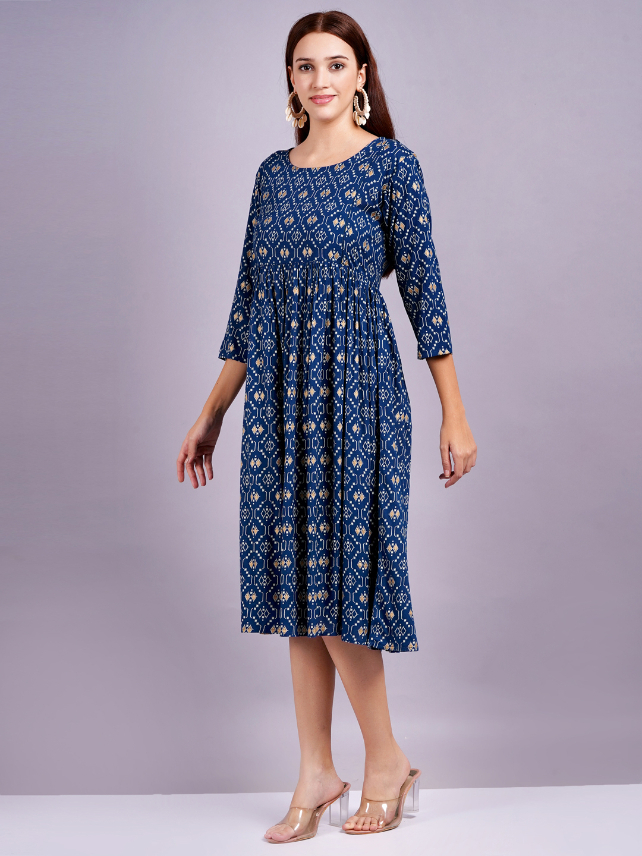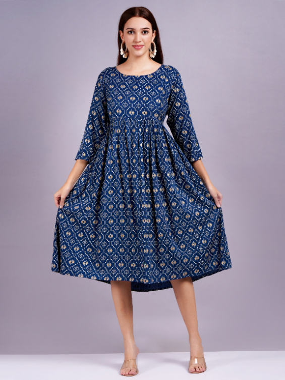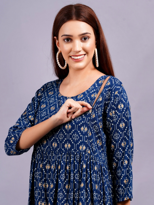 Embrace Comfort: Crafted from 140KG Rayon Fabric, this Navy maternity dress offers a breathable and soft fabric that keeps you cool and comfortable all day long, making it perfect for any occasion. Conceal Baby Bump: The feeding kurti features a unique design around the tummy area.