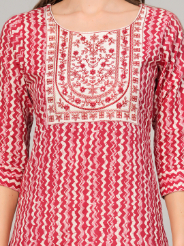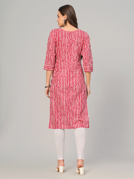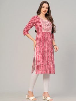 Indulge in timeless elegance with our Womens Embroidery Printed Kurti. Crafted from soft cotton fabric, this straight silhouette features a chic side slit and a classic round neck. With 3/4 sleeves and a calf-length cut at 45 inches, it effortlessly combines comfort and style.