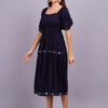 Dark Navyblue rayon midi dress with a U-neck, 45-inch length, flare slit, half sleeves with elastic, and thread floral embroidery on sleeves and bottom surface. Elegant and stylish for any occasion.