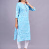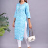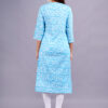 This Skyblue cotton kurta features a delicate floral print with a round neck, adorned with tassels and lace detailing. Its straight silhouette and 3/4th sleeves offer a comfortable and stylish fit, perfect for casual daywear.