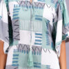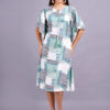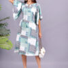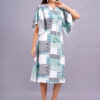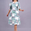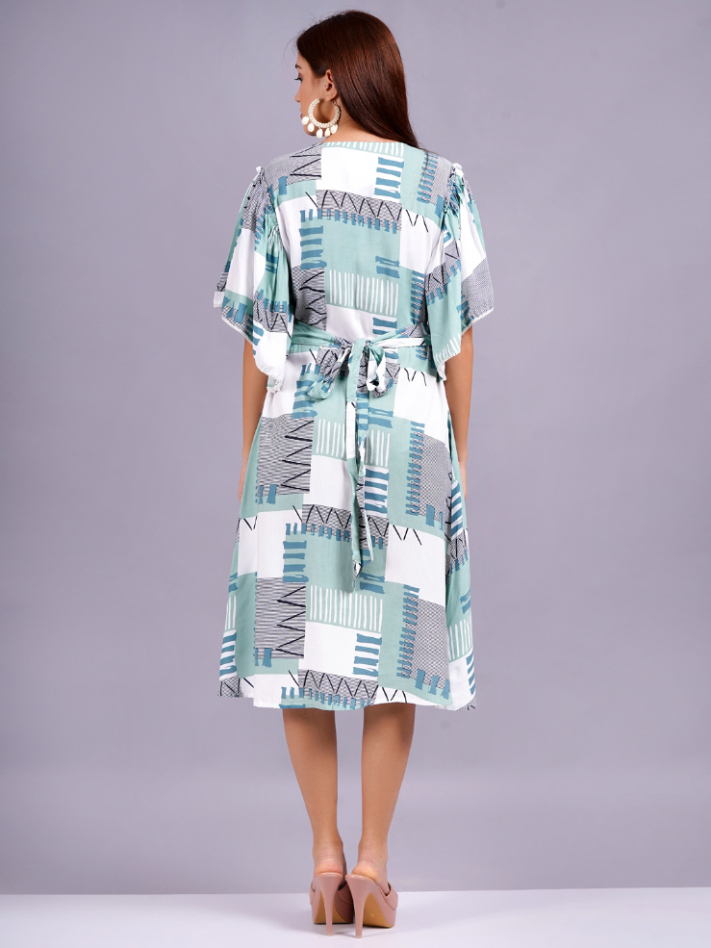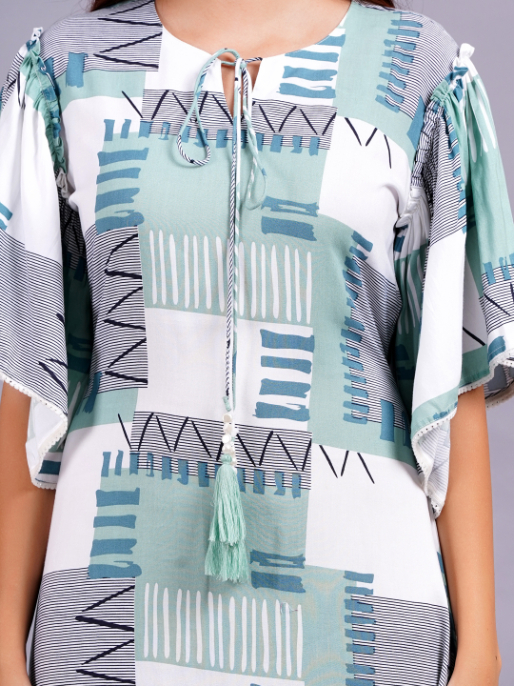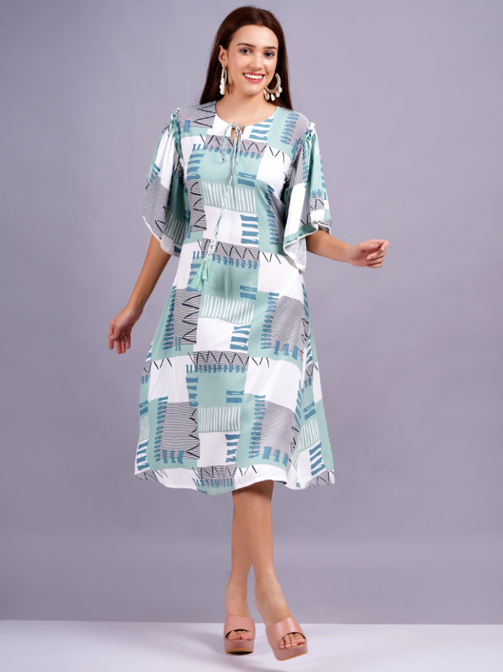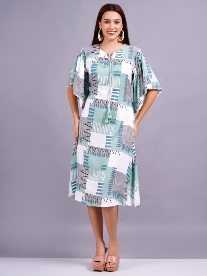 This is a stylish A-line rayon dress with flutter sleeves and an abstract geometric print in Rama, blue, and white. The relaxed fit and comfortable fabric make it perfect for casual outings.