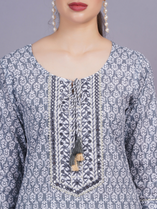 Introducing a Women’s Grey Cotton Kurta. Mirror Embroidery Handwork, Round Neck, Regular Sleeves, Side Slit, Straight Hemline, Calf Length.