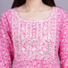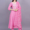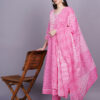 Indulge in floral elegance with our Women’s Cotton Kurta Pant Dupatta Set in a refreshing Pink hue. Featuring a classic round neck and 3/4 sleeves, the Anarkali-style calf-length kurta exudes grace at 48 inches.