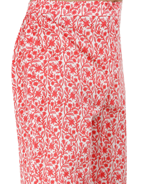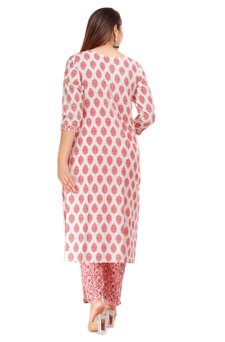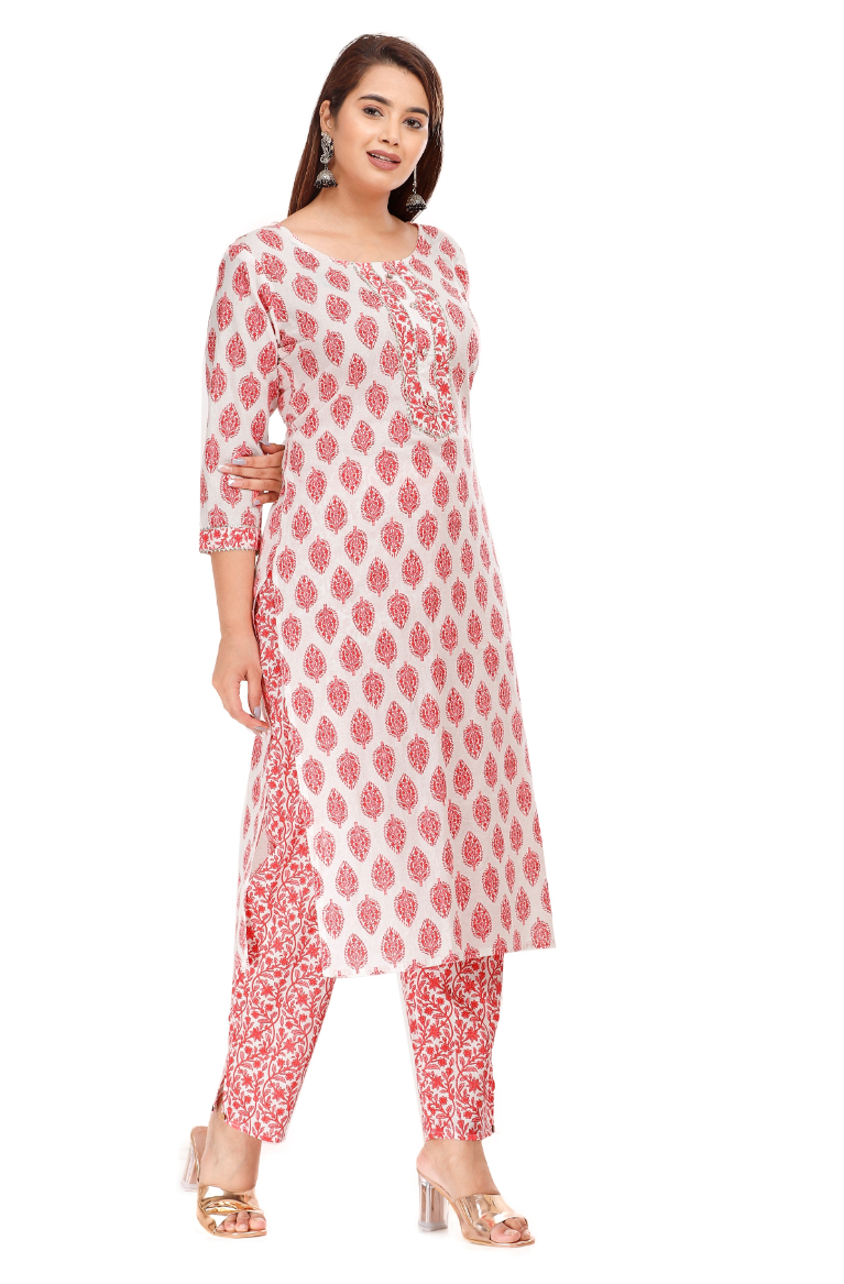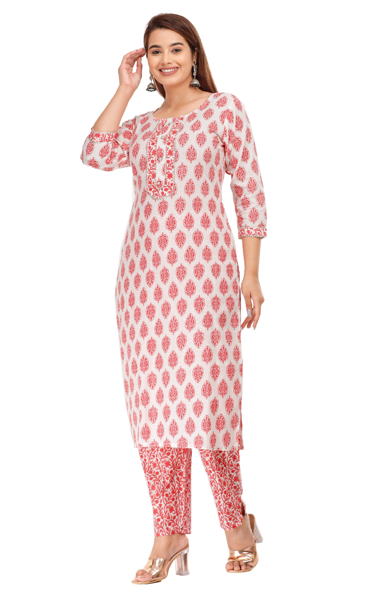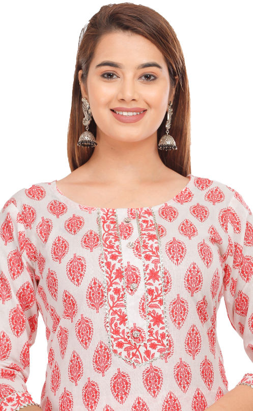This Straight Kurta Pant set made With Silver Foil- floral Print ,Cotton Fabric, Pink Color,Calf Length(45inch), Round neck,3/4 Sleeves. Trouser Is Made with waist elastic band. Stylish Moti and Gotta patti Handwork On Front Panel and sleeves.