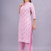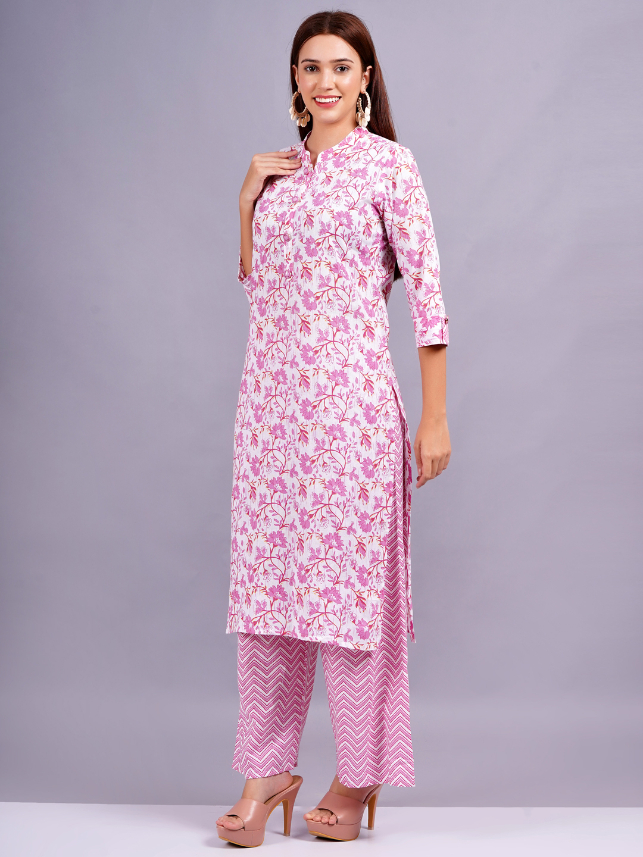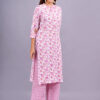 This is a Pink cotton kurta Palazzo set with a Floral Print pattern on the kurta, featuring a detailed embroidered yoke. It comes with chevron-printed pants and a matching dupatta with intricate motifs, perfect for everyday wear or light festive occasions.