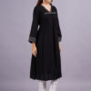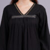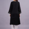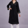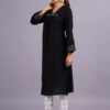 This two-piece set is made from soft rayon fabric, featuring a long, black kurta with intricate detailing along the V-neckline and cuffs. The straight-cut white pants have a subtle black print.